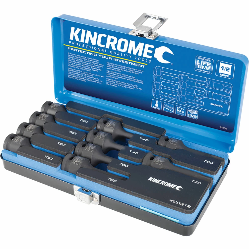 - Contents:10 X 1/2″ Drive Torx Impact SocketsT20, T25, T27, T30, T40, T45, T50, T55, T60, T70