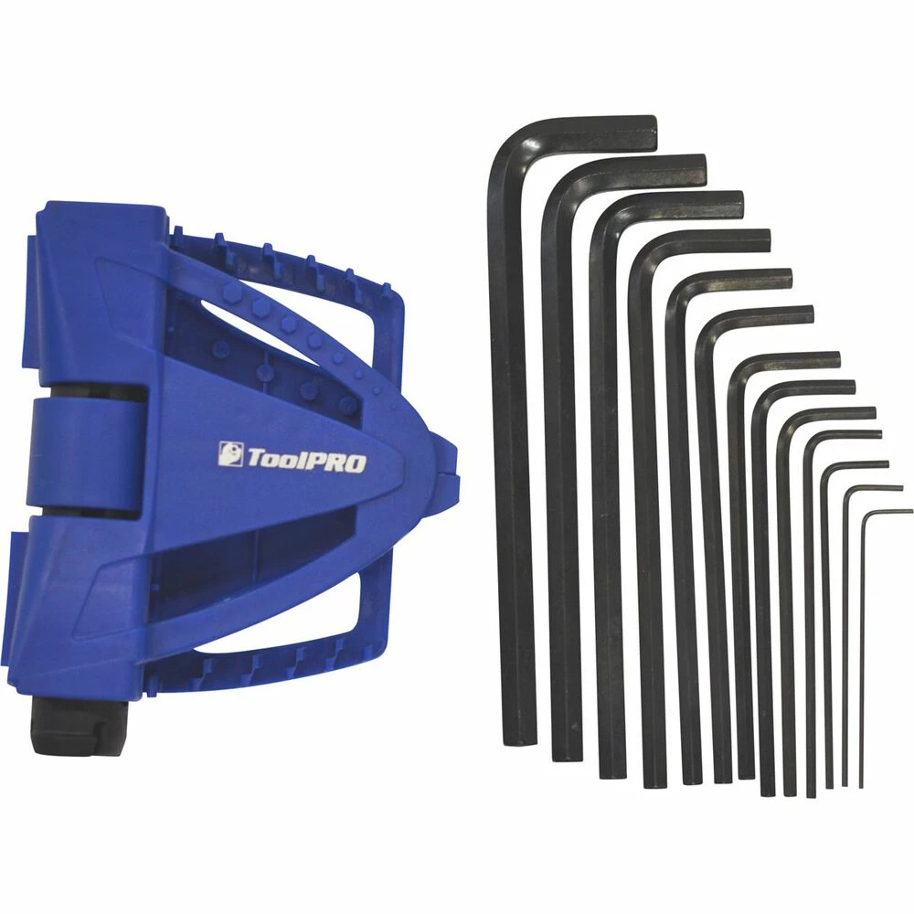 Equipped with a T-handle and 13 pieces, this ToolPro Metric Hex Key Set comes very compact for easy storage and transportability. Although the set is housed in a plastic casing, all pieces are coated in black oxide to provide maximum corrosion resistance, and chrome vanadium steel to ensure strength and durability. The set includes a removable T-handle and the following 13 metric sized pieces: 1.5, 2, 2.5, 3, 4, 4.5, 5, 5.5, 6, 7, 8, 9 and 10mm. The case is designed to lock all pieces in securely and has all sizes listed for easy locating.